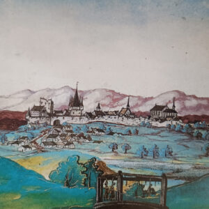 Widok Strzelec z 1535 roku, wedug akwareli w wydaniu pozycji ksiązkowej ,,Historische Ansichten aus vier Jahrhunderten – Oppeln, Falkenberg Gross Strehlitz“ Angeliki Marsch